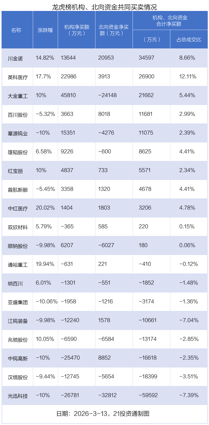 3月13日,27只个股龙虎榜出现了机构的身影,机构合计净买入3.86亿元。具体来看,机构净买入14股,净卖出13股。