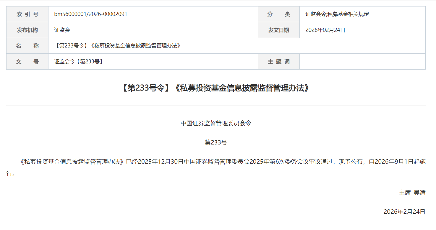2月27日,中国证监会发布《私募投资基金信息披露监督管理办法》(以下简称《办法》),明确自2026年9月1日起施行。