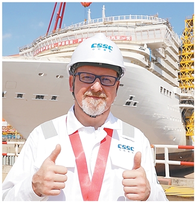 罗瓦蒂在建造中的“爱达·花城号”邮轮前。回盛瑶摄