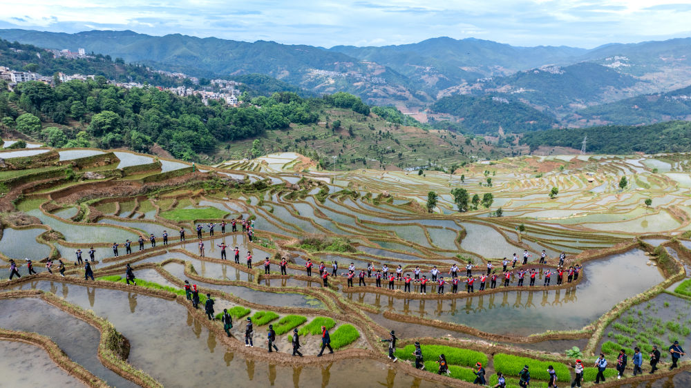 2025年5月2日,在云南省红河县甲寅村“开秧门”仪式上,村民身着民族服饰,沿着田埂踏歌而行(无人机照片)。新华社记者 胡超 摄