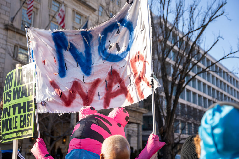 3月7日,人们在美国华盛顿参加集会,抗议美国和以色列对伊朗发动军事打击。新华社发(李源清摄)