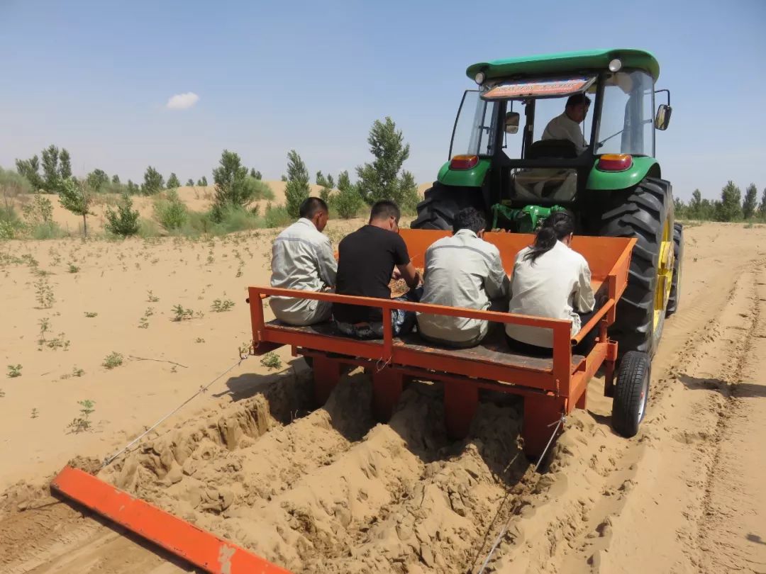 ↑在库布其沙漠治理实践中,治沙龙头企业亿利集团探索创新了微创植树、迎风坡造林、甘草平移栽种、苦咸水治理与综合利用、光伏提水灌溉、原位土壤修复、大数据和无人机治沙等100多项沙漠生态技术成果,研发了沙柳、柠条、杨柴、花棒等 1000 多种耐寒、耐旱、耐盐碱的植物种子。图为亿利集团工人正用机械在沙漠里种植甘草。经济日报记者 黄俊毅摄