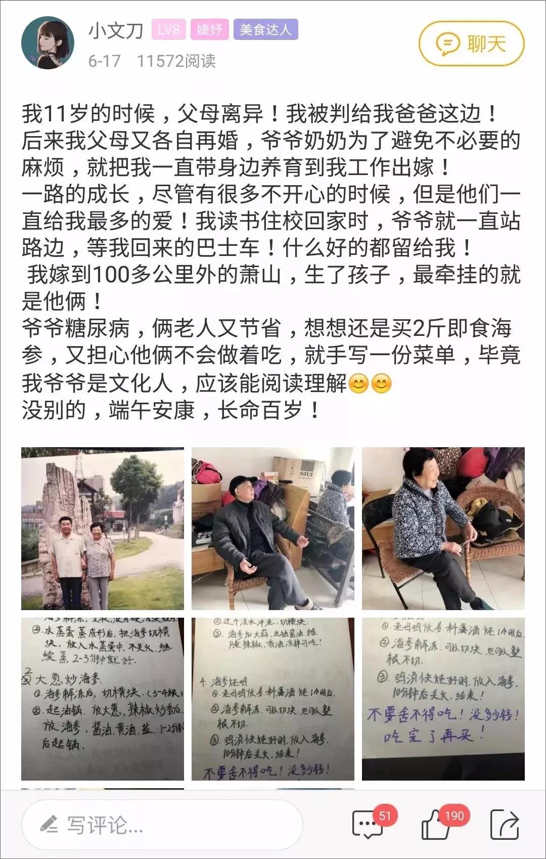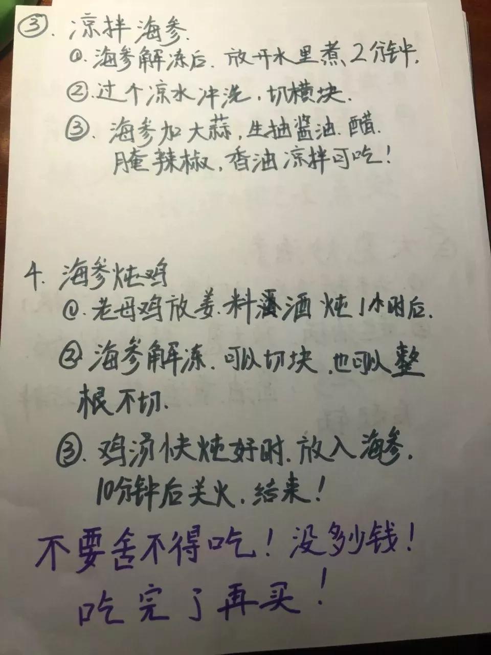 爷爷今年80岁,奶奶也78岁了。这次,在先生的建议下,“小文刀”买了2斤海参带回老家,送给爷爷奶奶吃。担心他俩不会做着吃,她就写下了被网友们刷屏的那份菜单,包括了蒸、炒、炖、凉拌四种做法,在最后还写着“不要舍不得吃!没多少钱!吃完了再买!”