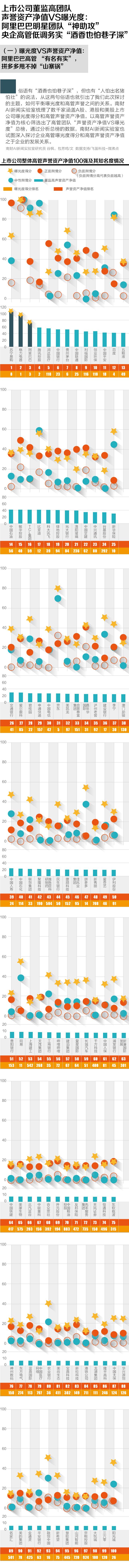 从排名来看,苏宁易购、格力电器、阿里巴巴、腾讯控股、润达医疗位列董监高团队声誉资产净值榜前5,其对应的曝光度得分排名则分别为8、1、3、2、118。