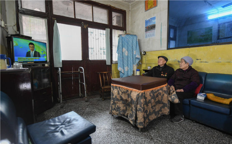 张富清和老伴在家看电视(3月31日摄)。新华社记者程敏摄