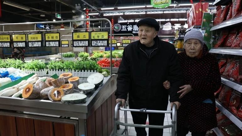 △张富清老两口一起逛超市。