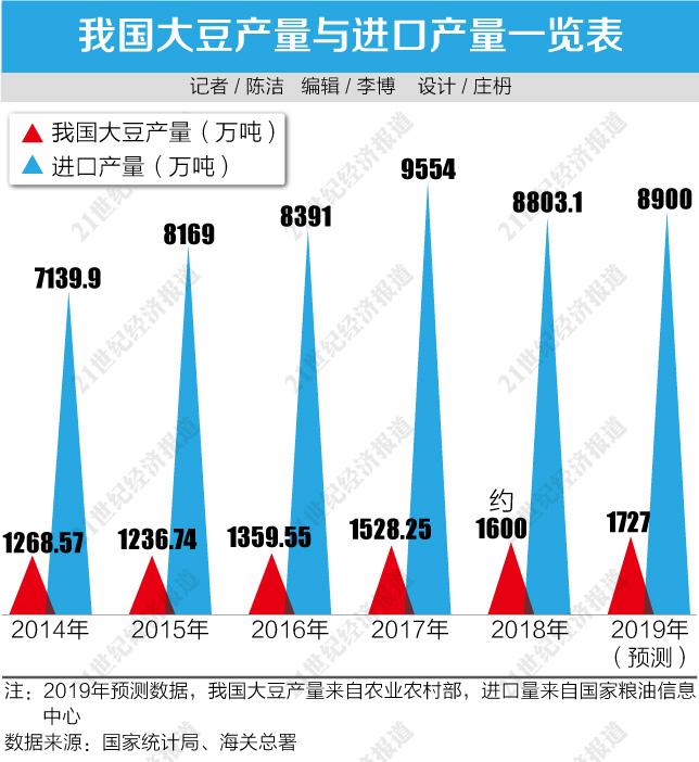我国目前仍是最大的大豆进口国,据国家粮油信息中心估计,2019年大豆仍然要进口8900万吨,是农业农村部预估2019年国产大豆产量的5倍。