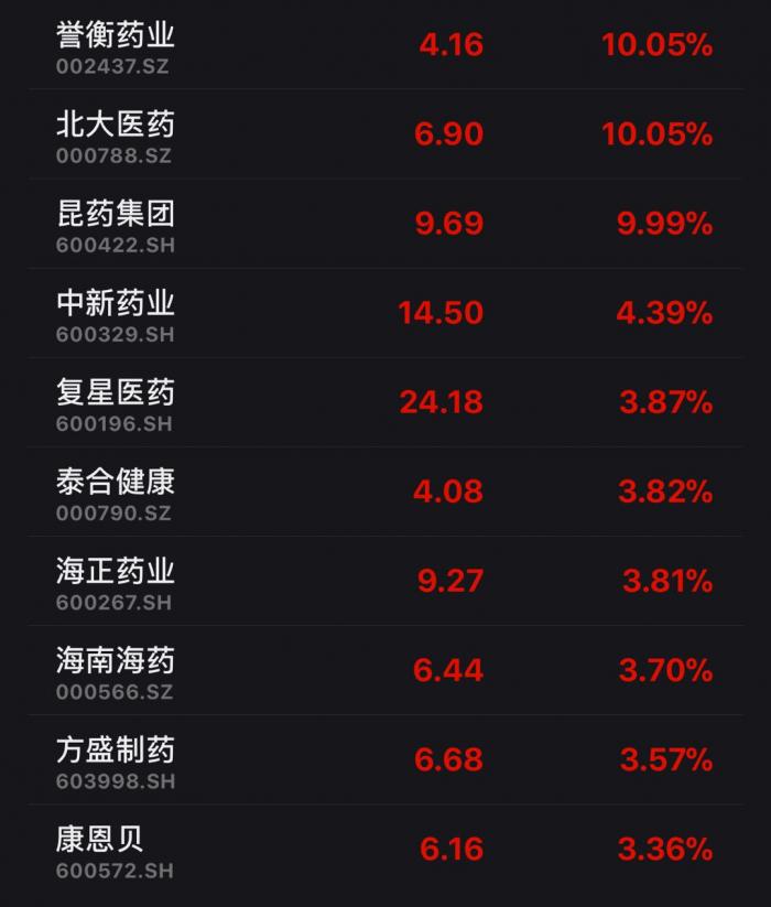 随后,昆药集团开盘即一字涨停,同样具有青蒿素相关专利或生产项目的复星医药大涨3.87%、誉衡药业涨停、华润双鹤上涨4.36%……