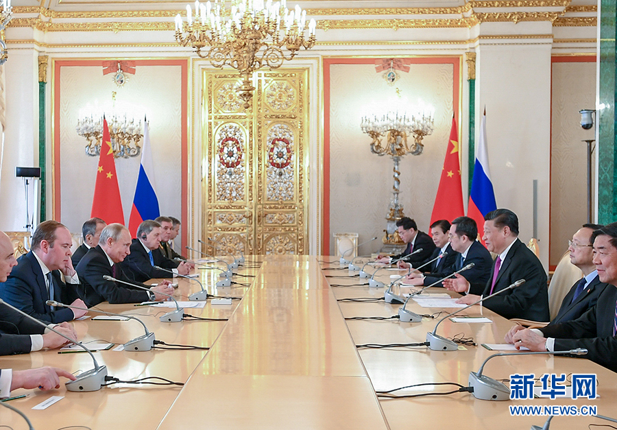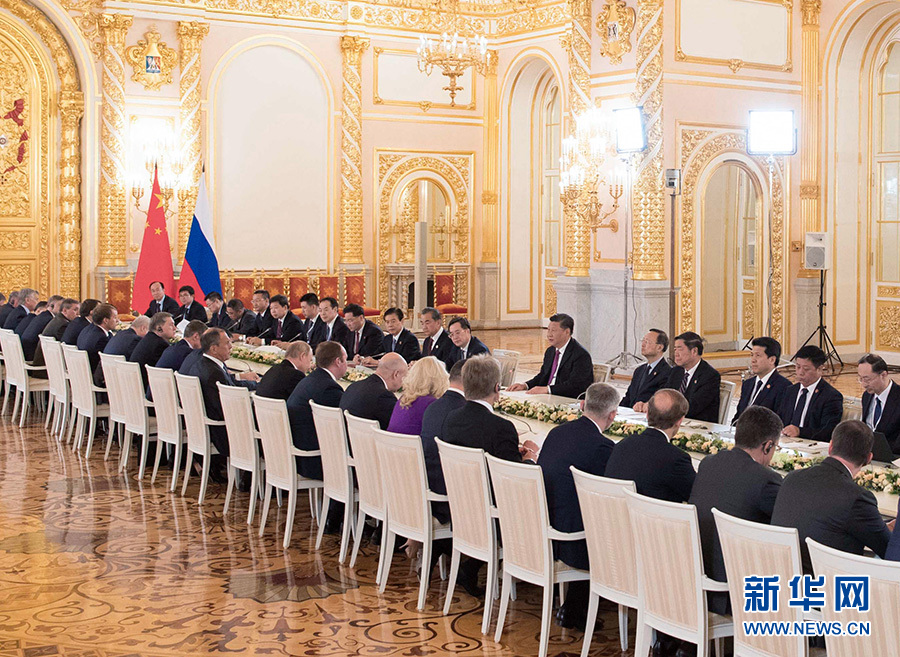 6月5日,国家主席习近平在莫斯科克里姆林宫同俄罗斯总统普京会谈。 新华社记者谢环驰摄
