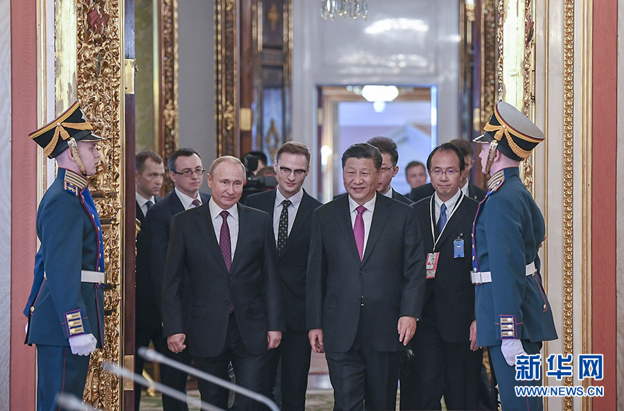 6月5日,国家主席习近平在莫斯科克里姆林宫同俄罗斯总统普京会谈。这是两国元首步入会场。 新华社记者谢环驰摄