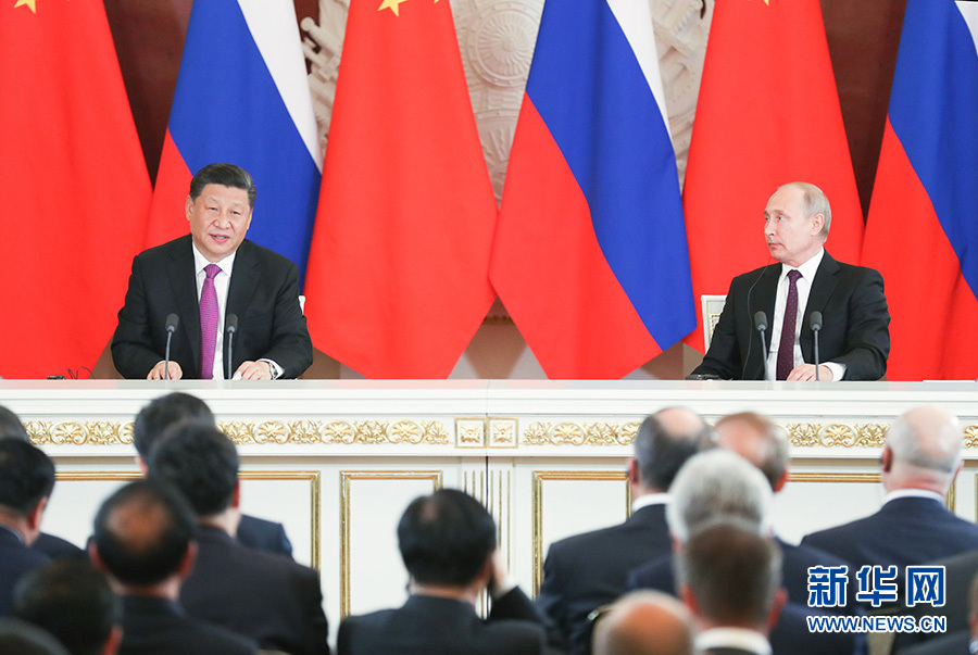 6月5日,国家主席习近平在莫斯科克里姆林宫同俄罗斯总统普京会谈。会谈后,两国元首共同签署《中华人民共和国和俄罗斯联邦关于发展新时代全面战略协作伙伴关系的联合声明》、《中华人民共和国和俄罗斯联邦关于加强当代全球战略稳定的联合声明》,并见证多项双边合作文件的签署。 新华社记者李学仁摄