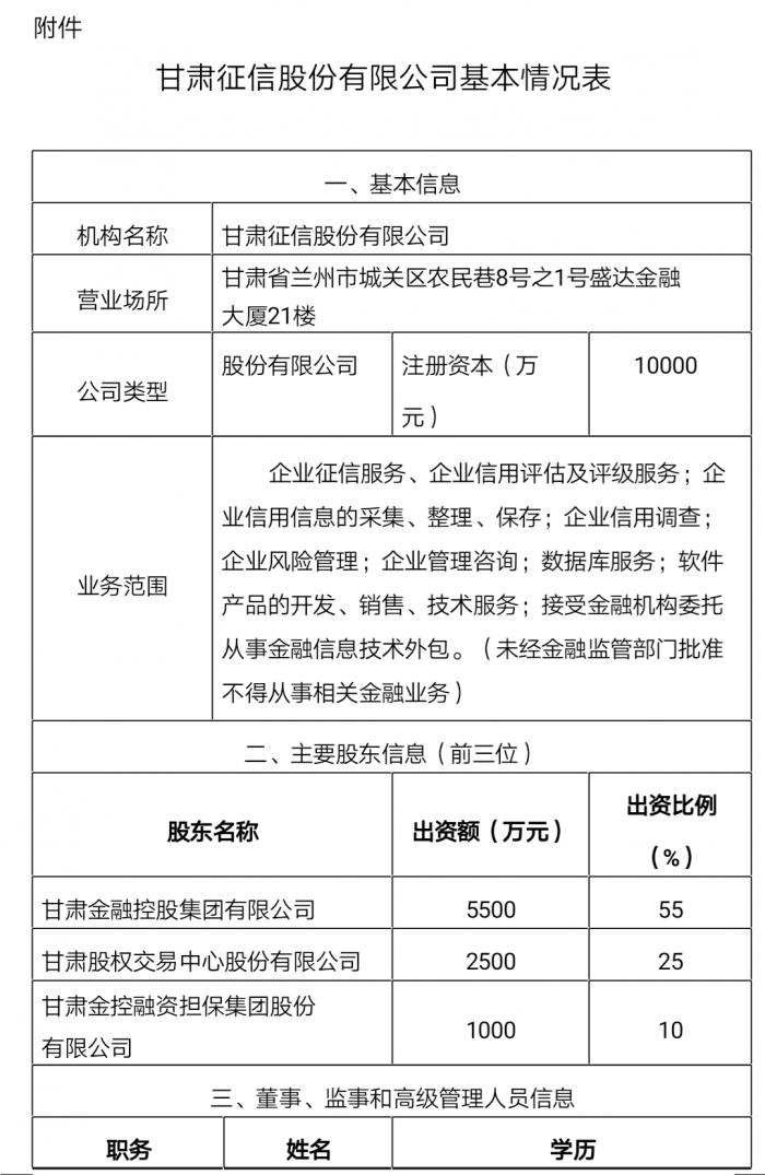 8月9日,中国人民银行兰州中心支行公示了甘肃征信股份有限公司企业征信机构备案。