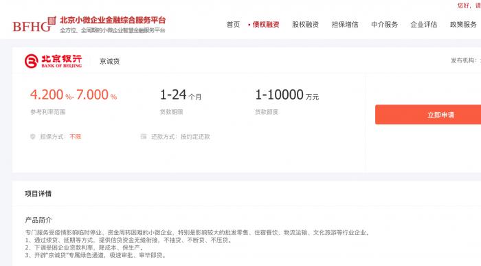 据查询,该款产品的担保方式不限,参考利率4.2%-7%,贷款期限不超过1年,最高可贷1亿元。其介绍称,该产品专门服务受疫情影响临时停业、资金周转困难的小微企业,特别是影响较大的批发零售、住宿餐饮、物流运输、文化旅游等行业企业。通过续贷、延期等方式,提供信贷资金无缝衔接,不抽贷、不断贷、不压贷;下调受困企业贷款利率,降成本、保生产;开辟“京诚贷”专属绿色通道,极速审批、审毕即贷。
