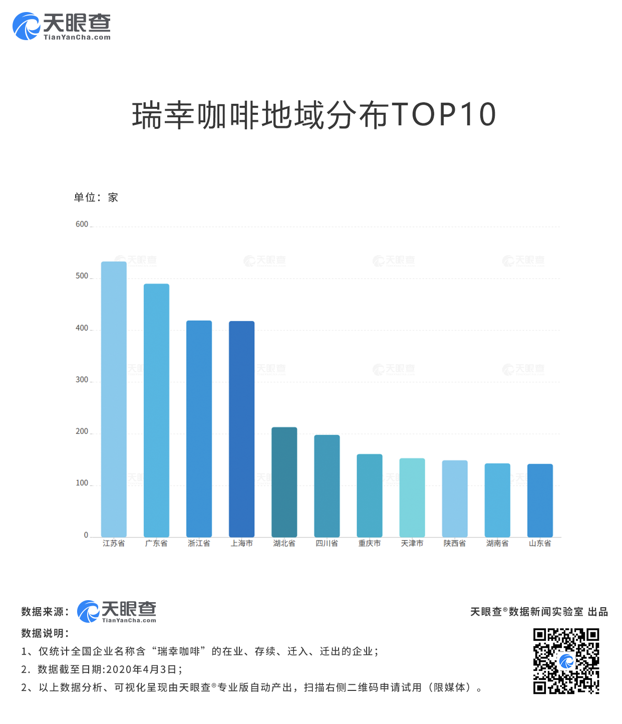 天眼查专业版数据显示,截至2020年4月3日,全国企业名称中含“瑞幸咖啡”的在业、存续、迁入和迁出的企业共计3,913家。从地域分布来看,江苏省以533家“瑞幸咖啡”企业居全国首位,第二名、第三名依次为490家的广东省和419家的浙江省。排在前列的还有上海市、湖北省、四川省、重庆市、天津市、陕西省、湖南省和山东省。