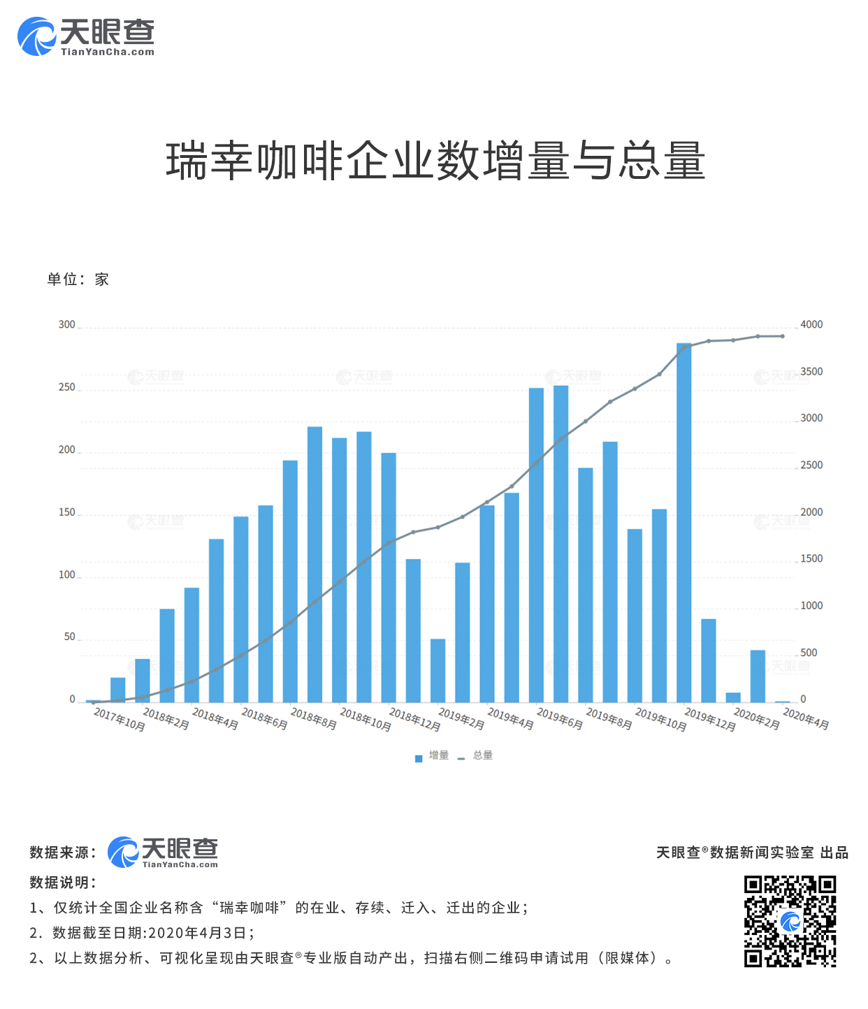 从企业数量来看,瑞幸咖啡2017年成立新公司2家;2018年成立新公司数量激增,达到1,704家;2019年成立新公司数量达到2,089家;2020年至今,企业名称中包含“瑞幸咖啡”的新增企业则为118家。
