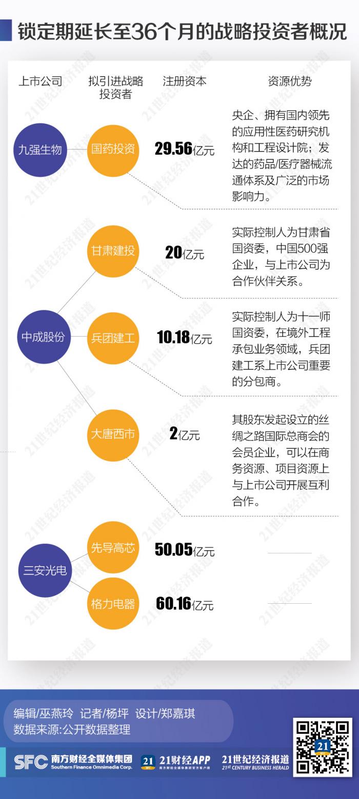 近日,21世纪经济报道记者注意到,九强生物、中成股份等先后发布公告,宣布非公开发行股票认购对象承诺延长持股锁定期至36个月。而这两家公司拟引进的对象均为战略投资者。