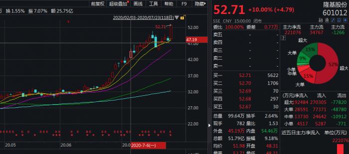 7月23日,隆基股份涨停,收盘市值达1988亿元,另一龙头企业通威股份也取得了8.43%的涨幅,总市值站稳1000亿元以上。