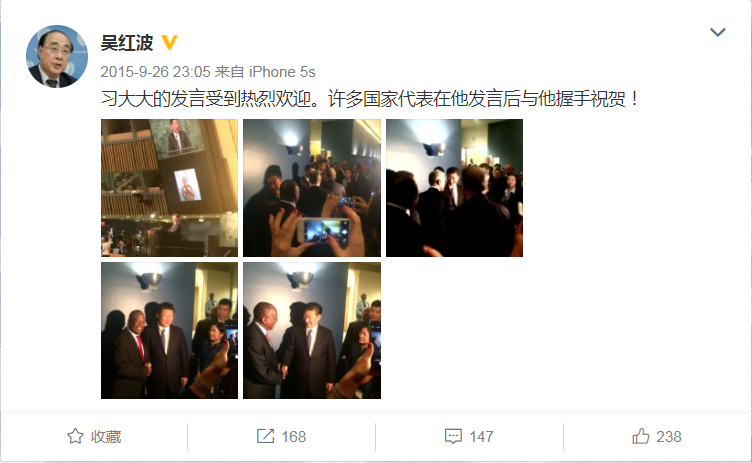 “习主席是当地时间9月26日凌晨抵达纽约的,当天上午10点就出现在联合国总部大会厅。联合国发展峰会是习主席在联合国出席的第一场活动。”参加报道的新华社记者徐剑梅回忆说。 当大会主席宣布请中华人民共和国主席发言时,习主席迈着稳健的步伐登上联合国讲坛,热烈的掌声在大会厅响起。