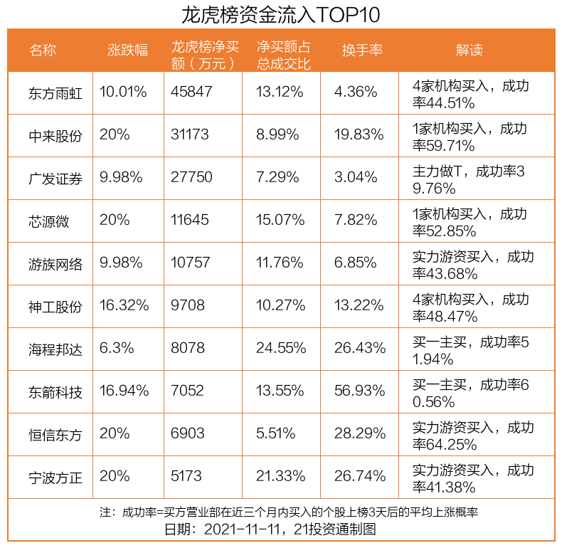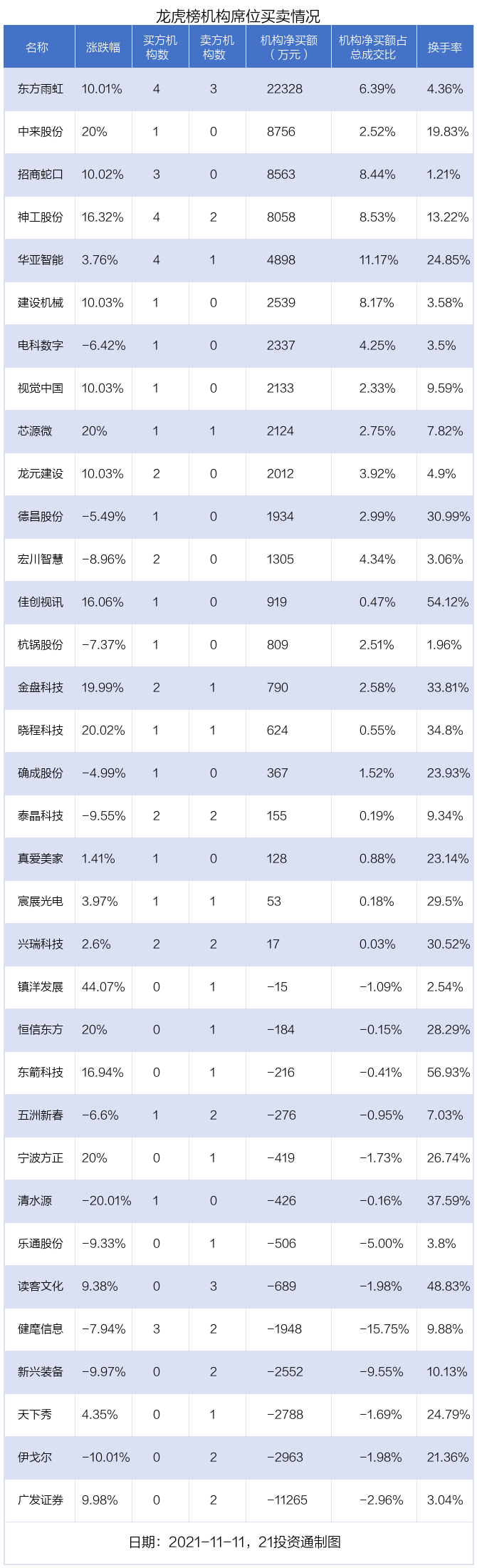 11月11日,34只个股龙虎榜出现了机构的身影,机构合计净买入4.66亿元。具体来看,机构净买入21股,净卖出13股。