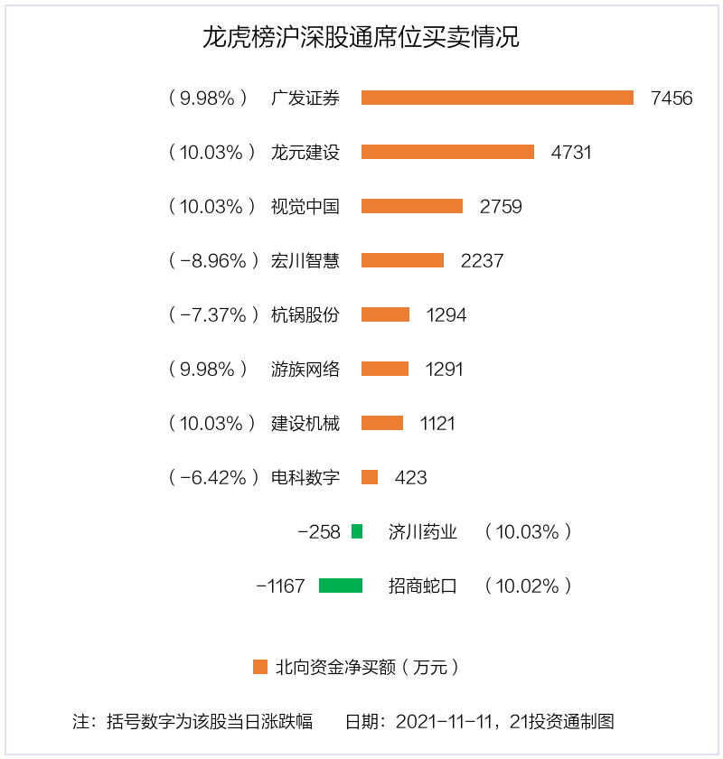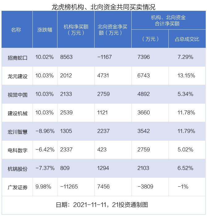 值得注意的是,机构和北向资金共同净买入了龙元建设、视觉中国、宏川智慧、杭锅股份、建设机械、电科数字等6股;在广发证券,招商蛇口上出现分歧,机构净卖出广发证券1.13亿元,北向资金净买入7455.64万元;机构净买入招商蛇口8563.04万元,北向资金净卖出1166.71万元。