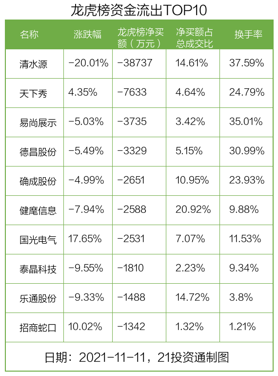 而龙虎榜中资金净流出最多的是环保概念股清水源(300437.SZ),被净卖出为3.87亿元,占总成交金额的14.61%。清水源收盘下跌20.01%,换手率为37.59%。