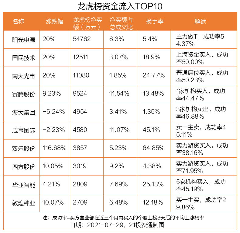 7月29日,上证指数上涨1.49%,深证成指上涨3.04%,创业板指上涨5.32%。盘后龙虎榜数据显示,共有33只个股因当日异动登上龙虎榜,资金净流入最多的是阳光电源(300274.SZ),达5.48亿元。