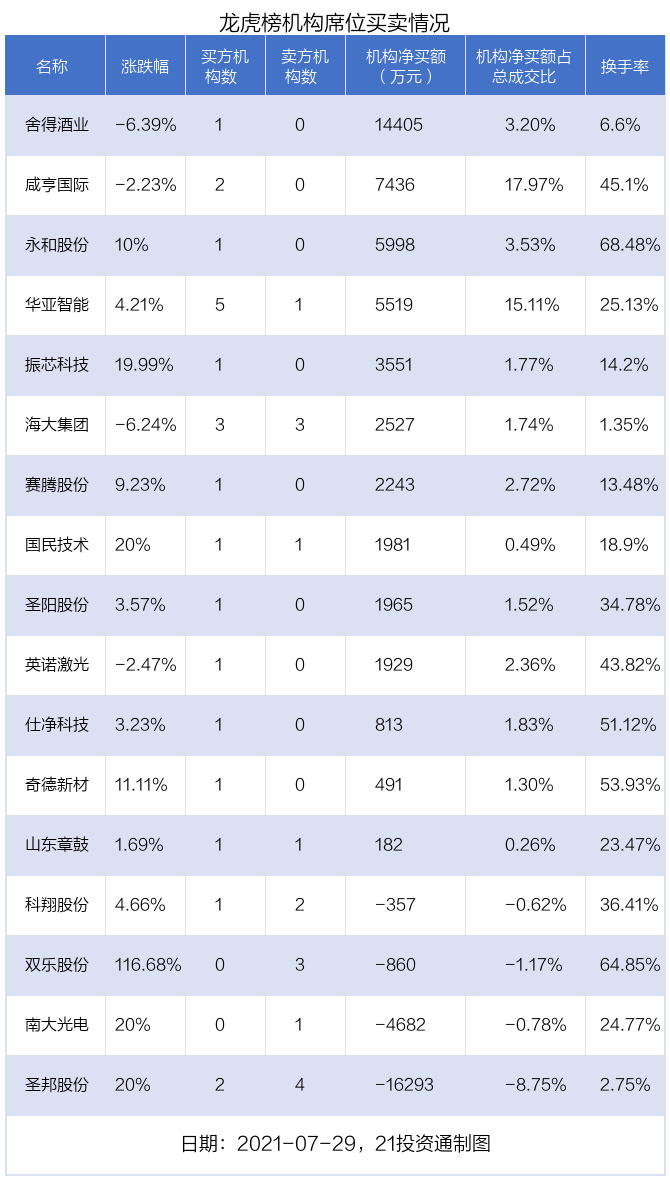 7月29日,17只个股龙虎榜出现了机构的身影,机构合计净买入2.68亿元。具体来看,机构净买入13股,净卖出4股。