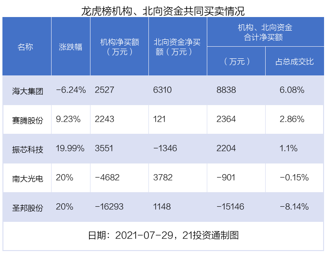 值得注意的是,机构和北向资金共同净买入了海大集团、赛腾股份等2股;在南大光电,圣邦股份,振芯科技上出现分歧,机构净卖出南大光电4682.26万元,北向资金净买入3781.66万元;机构净卖出圣邦股份1.63亿元,北向资金净买入1147.56万元;机构净买入振芯科技3550.8万元,北向资金净卖出1346.47万元。