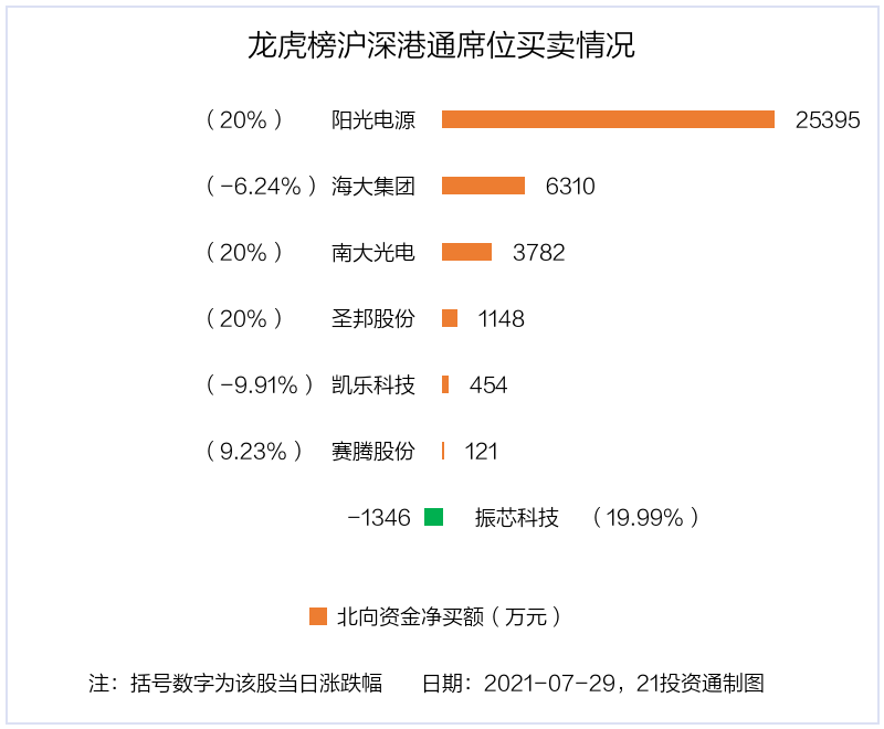 7月29日,北向资金参与龙虎榜中的个股共有7只,合计净买入3.59亿元。其中沪股通净买入2 股,合计净买入575.27万元;深股通净买入4 股,净卖出1 股,合计净买入3.53亿元。