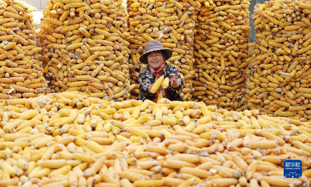 山东省临沂市郯城县郯城街道宋屯村村民在整理晾晒收获的玉米(9月23日摄)。新华社发(张春雷摄)