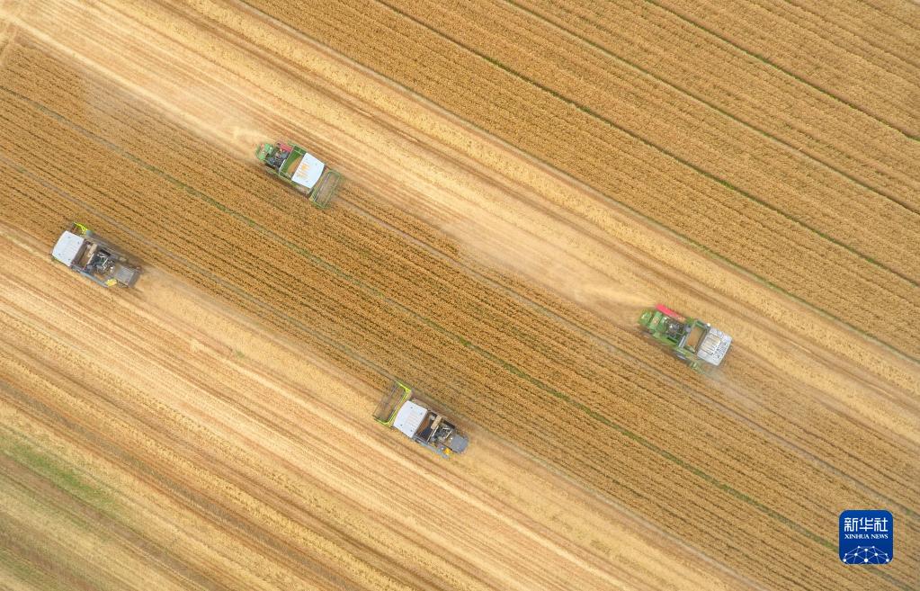 在山东省聊城市茌平区菜屯镇任庄村,种粮大户组织联合收割机收获小麦(无人机照片,6月12日摄)。新华社发(赵玉国摄)