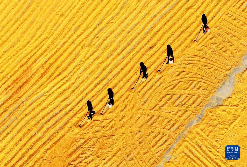山东省临沂市平邑县农民在晾晒收获的玉米(无人机照片,10月23日摄)。新华社发(武纪全摄)