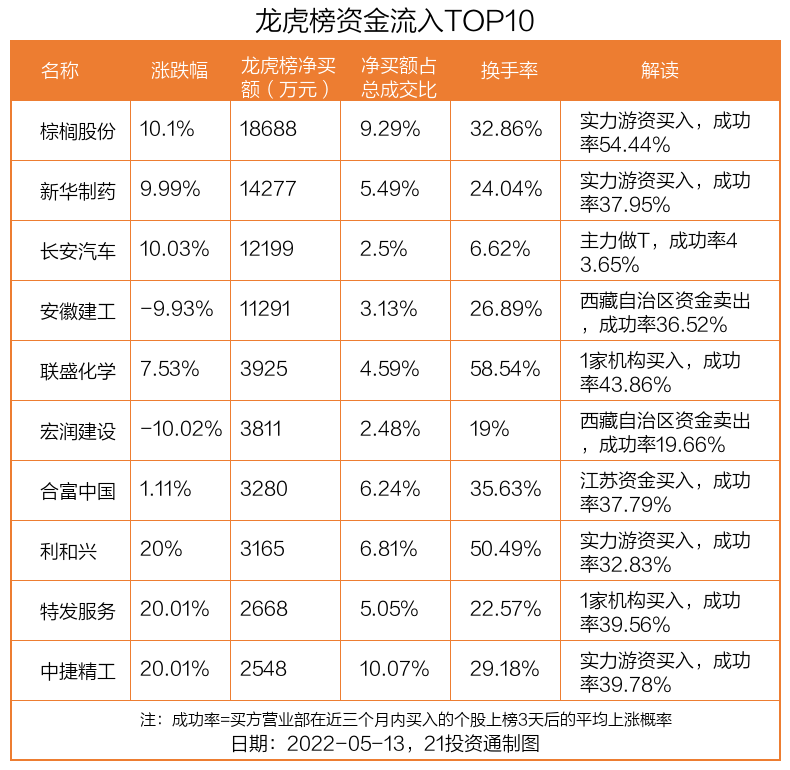 5月13日,上证指数上涨0.96%,深证成指上涨0.59%,创业板指上涨0.29%。盘后龙虎榜数据显示,共有54只个股因当日异动登上龙虎榜,资金净流入最多的是棕榈股份(002431.SZ),达1.87亿元。