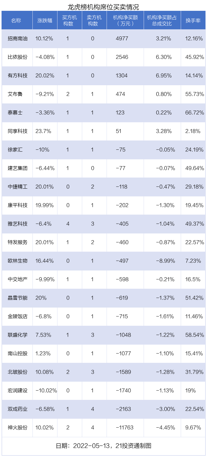 5月13日,22只个股龙虎榜出现了机构的身影,机构合计净卖出1.37亿元。具体来看,机构净买入6股,净卖出16股。