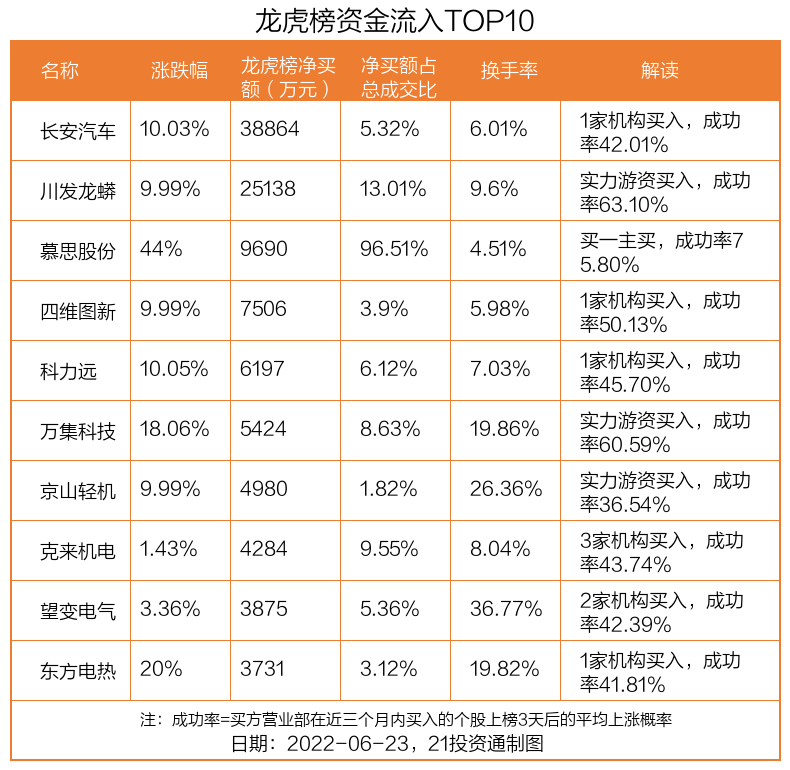 6月23日,上证指数上涨1.62%,深证成指上涨2.19%,创业板指上涨3.09%。盘后龙虎榜数据显示,共有74只个股因当日异动登上龙虎榜,资金净流入最多的是长安汽车(000625.SZ),达3.89亿元。