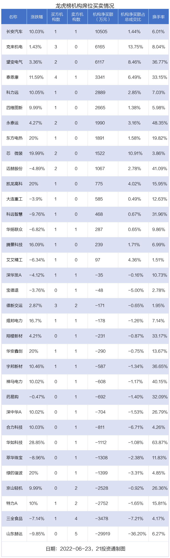 6月23日,34只个股龙虎榜出现了机构的身影,机构合计净卖出6248.91万元。具体来看,机构净买入16股,净卖出18股。