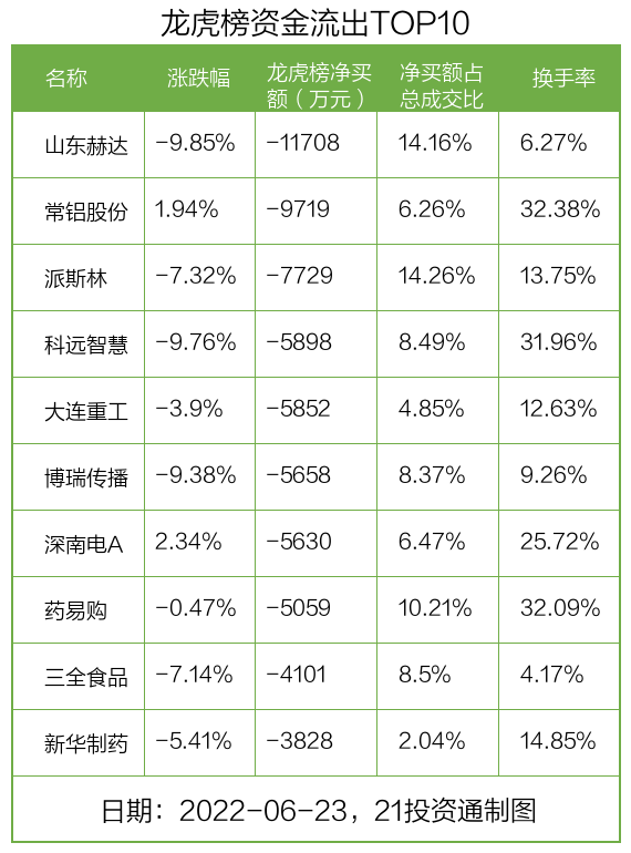龙虎榜中资金净流出最多的是山东赫达(002810.SZ),被净卖出为1.17亿元,占总成交金额的14.16%。山东赫达收盘下跌9.85%,换手率为6.27%。