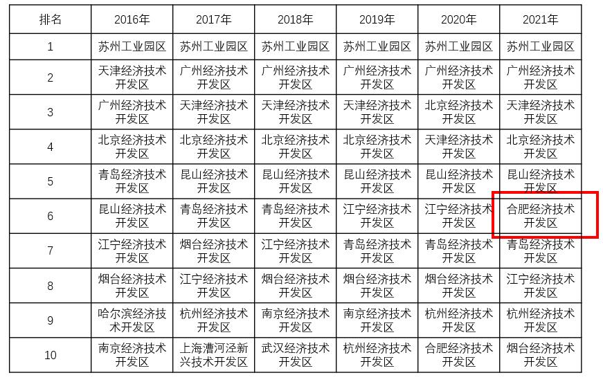 在此次发布的评价综合评价中,合肥经开区的排名再创历史新高,排名全国第6、前进4位。在实际使用外资单项排名前10榜单中,合肥经开区排名第10位,是唯一一个不是沿海省市的国家级经开区。从地理位置来看,合肥经开区是内陆地区利用外资程度最高的经开区,成为了中西部经开区的代表。