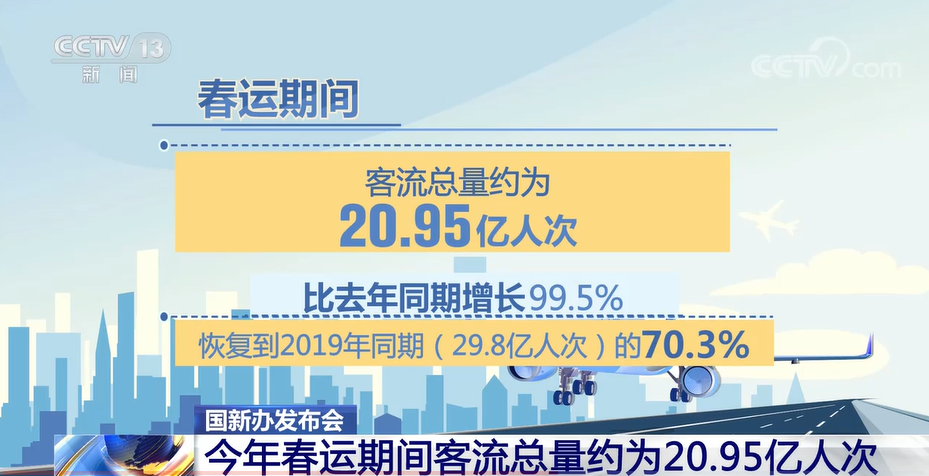 初步分析研判,春运期间客流总量约为20.95亿人次,比去年同期增长99.5%,恢复到2019年同期(29.8亿人次)的70.3%。