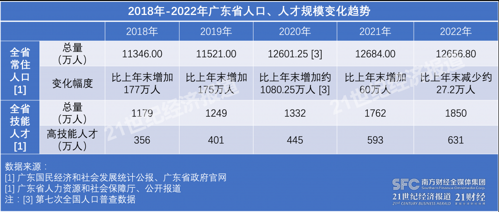 南方财经全媒体记者梳理过去5年广东人口及人才数据发现,2018年至2022年间,广东省常住人口规模从2018年的11346万人逐年增加至2021年的12684万人,并在2022年略微回落至12656.80万人。而同期广东全省技能人才总量及高技能人才数量均呈持续稳定上升态势。