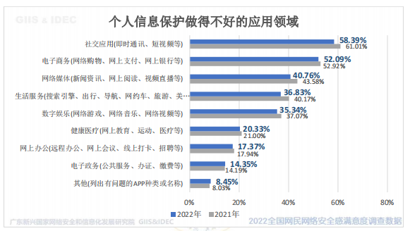和去年相比,受访网民对个人信息保护状况的正面评价有所提升,正面评价提升了 1.38个百分点,负面评价下降了2.47 个百分点。数据显示,广东网民对我国个人信息保护的整体评价有所提升。但仍有42.40%的受访网民在使用网络过程中总是或经常被过度采集和使用个人信息。