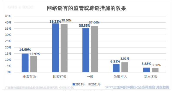 54.22%受访网民认为,互联网平台对网络谣言监管和辟谣措施非常有效或比较有效,和去年相比,提升了3.12 个百分点。数据显示,互联网平台对网络谣言监管和辟谣措施比去年有明显改善。