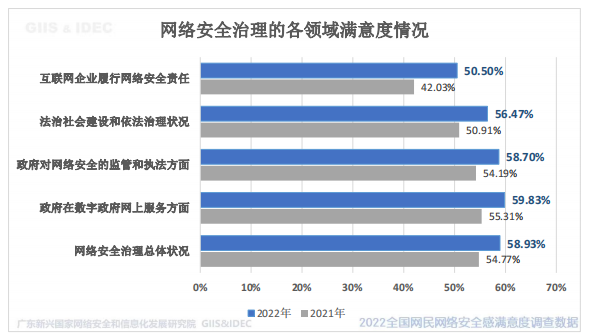 调查发现,58.93%受访广东网民对我国网络安全治理的状况满意,高于全国水平。广东省网民对网络安全治理的各领域满意度情况:互联网企业履行网络安全责任方面好评度(非常满意+较满意)为 50.50%(比去年大幅提升了 8.47 个百分点)。各领域评价满意度比全国水平高。显示广东省在网络安全领域的治理效果受到网民较高的满意度评价。