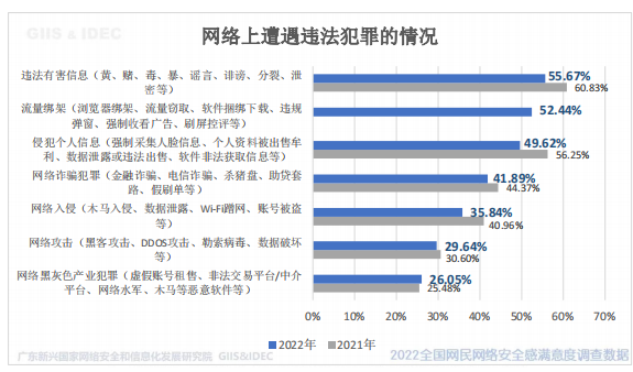 受访网民认为,遏制惩处网络违法犯罪的主要痛点仍是侵犯个人信息(关注度 66.97%)。和去年相比,除了网络黑灰产业犯罪外,各类网络违法犯罪行为的遭遇有所下降。显示打击网络违法犯罪行为的行动取得良好效果。