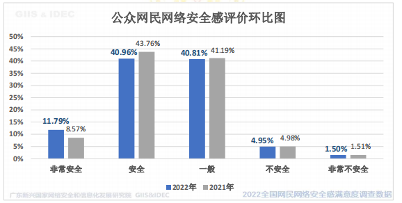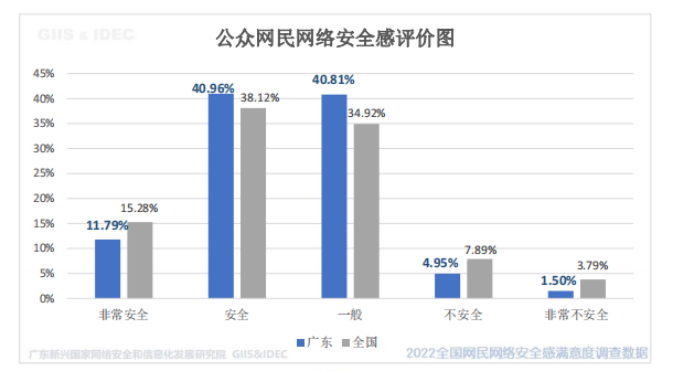 《广东区域报告》显示,在整体安全感方面,2022 年广东省公众网民网络安全感的正面评价率为52.75%,其中感到安全占40.96%,非常安全占 11.79%,比 2021 年有所上升。