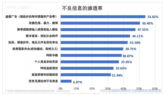 调查发现,广东网民遇到的不良信息主要是虚假广告。其中,虚假广告(超低价的培训课程和产品等)(选择率 53.82%)、传播色情、暴力、赌博(选择率 50.4%)、侮辱或毁谤他人或侵犯他人隐私(选择率 47.53%)。并且发现社交网络、自媒体平台、短视频平台存在恶俗网红、喷子黑粉横行、网络欺凌的情况很严重(比较严重+非常严重占 53.98%)。