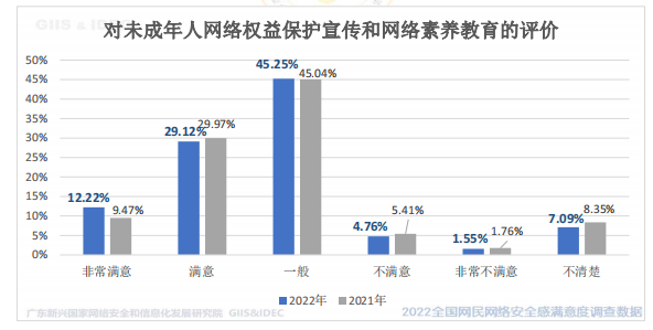 受访网民对本地学校/社区开展的未成年人网络权益保护宣传/网络素养教育课程等相关工作的评价:认为满意以上的占 41.34%,其中 12.22%公众网民认为非常满意,29.12%认为满意。45.25%认为一般。6.31%认为不满意或非常不满意,其中 4.76%认为不满意,1.55%认为非常不满意。