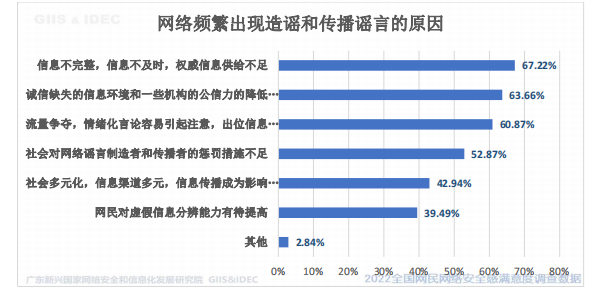 网络频繁出现造谣和传播谣言的原因为:第一位是信息不完整,信息不及时,权威信息供给不足(选择率 67.22%),第二位是诚信缺失的信息环境和一些机构的公信力的降低使得谣言得以传播(选择率 63.66%),第三位是流量争夺,情绪化言论容易引起注意,出位信息更容易被传播(选择率 60.87%)。数据显示,信息不完整和公信力降低是造成网络频繁出现造谣和传播谣言的主要原因。