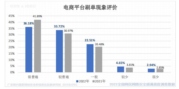 受访网民对网络购物安全状况满意度评价:认为满意以上的占 59.95%,35.76%认为一般,4.29%认为不满意或非常不满意,总体上满意度评价接近六成。在电商平台治理方面,69.90%受访网民认为,电商平台刷单现象普遍(很普遍或较普遍),数据显示电商平台对刷单问题的治理效果不佳,导致网民对电商平台上商家评价数据的信任度不高,相关部门应该加大刷单炒信等违法行为的打击力度。