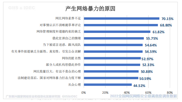 受访网民认为,产生网络暴力的原因为:第一位是网民网络素养不足,展70.15%;第二位是对事情认识不清晰就草率评论,占68.8%;第三位是网络管理制度和道德约束的缺乏,占61.82%。数据显示,提升网民网络素养,提高公民对网络信息内容和非正常舆论引导的辨别能力,能有效的防范网络暴力。